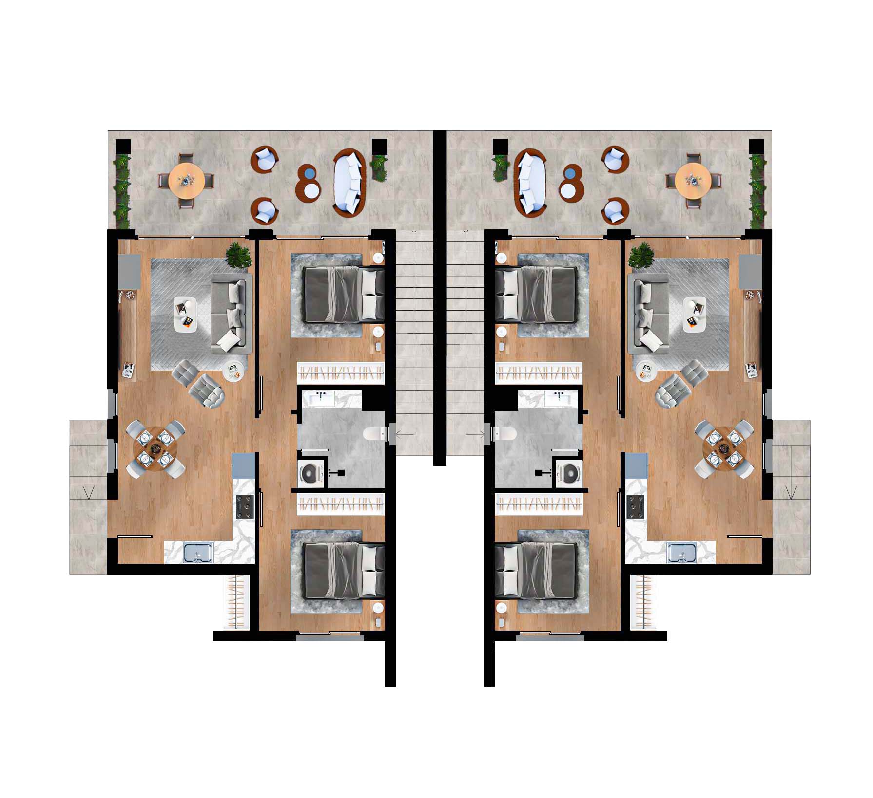 1+1, 65 m² 2+1, 115 m² 3+1, 144 m² Site içerisinde Denize mesafesi araba ile 5 dakika